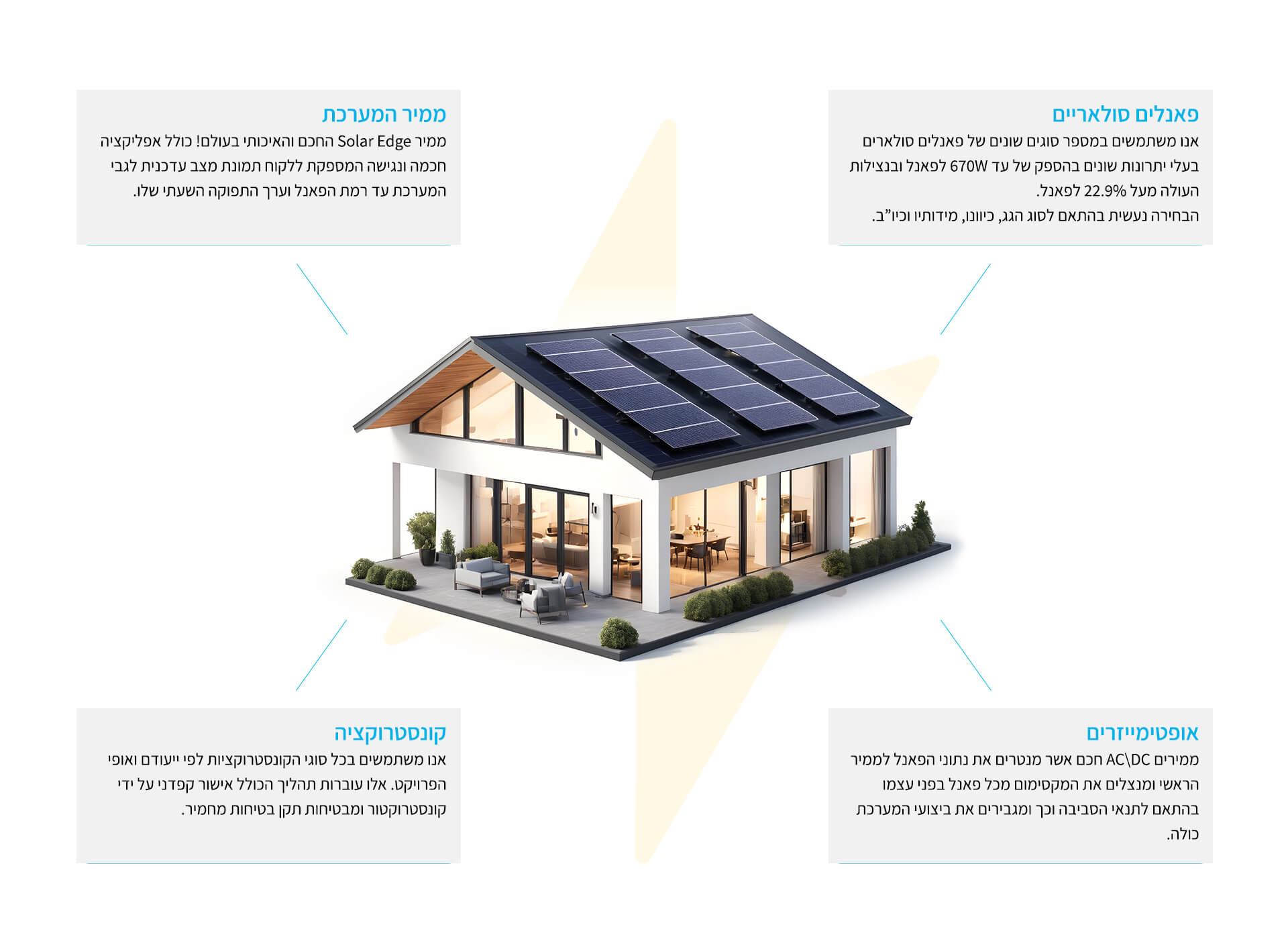 אנו מציעים פתרונות אנרגיה ירוקה המשלבים בין חדשנות טכנולוגית לבין ידע עשיר וניסיון רב בתחום, תוך שמירה על מחירים הוגנים. הטכנולוגיה שלנו מאפשרת לכם לנצל את כוח השמש בצורה הכי יעילה וחסכונית, מה שמבטיח לכם החזר מהיר על ההשקעה. כל אחת מהמערכות שלנו מתוכננת בהתאמה לצרכים הייחודיים של כל לקוח, תוך שימוש ברכיבים מהשורה הראשונה והתחשבות באופי המבנה והמיקום שלו. אנו מלווים אתכם בכל שלב, ומבטיחים שהמערכת תתפקד בצורה מיטבית לאורך שנים.